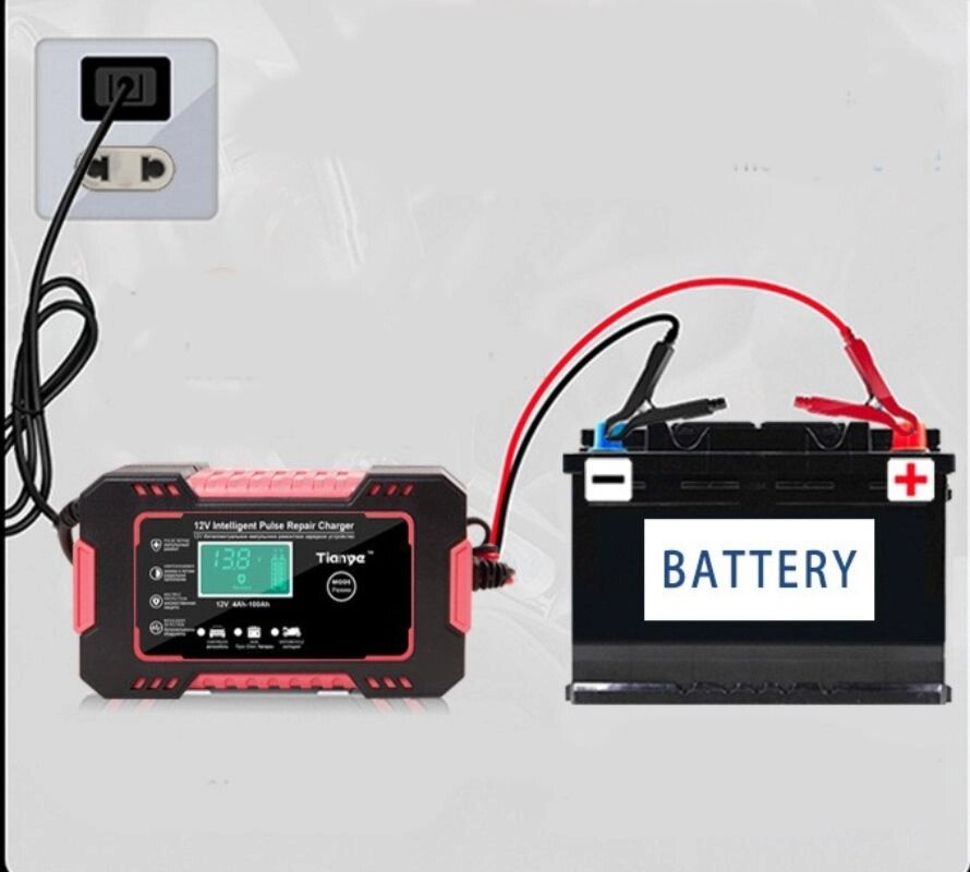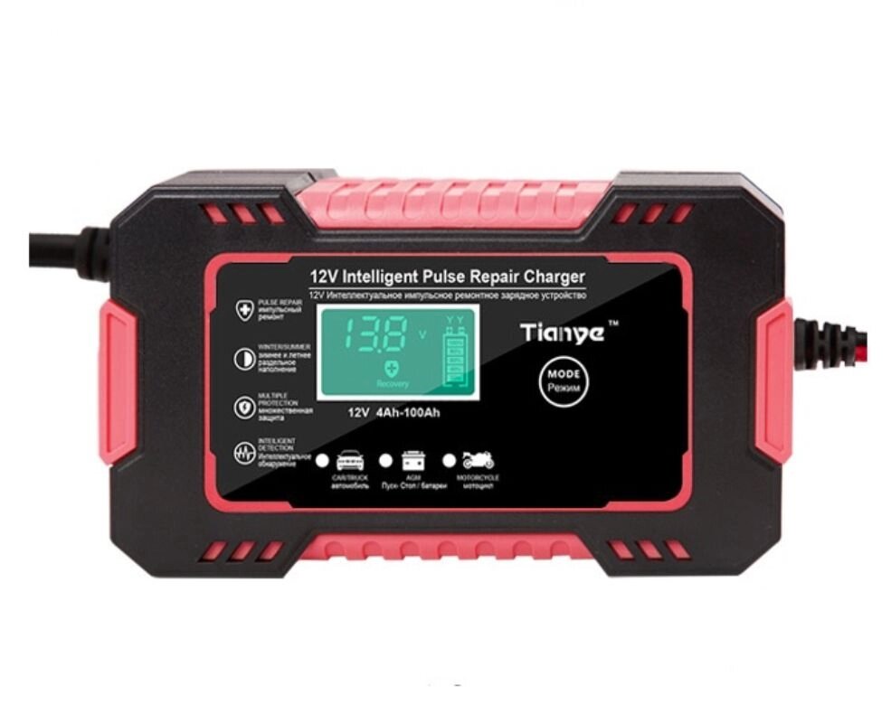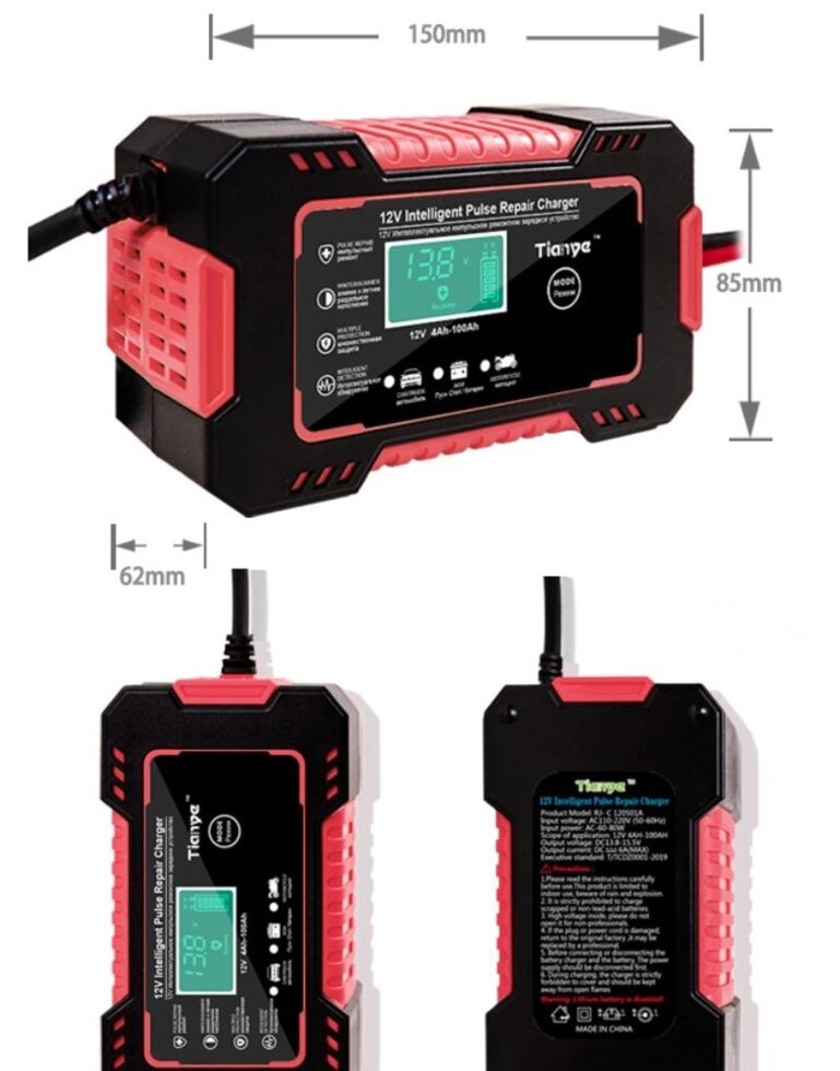 Импульсное зарядное устройство 12V 6A с микропроцессорным управлением для кислотных (свинцовых) аккумуляторов. Зарядное устройство имеет LCD дисплей с отображением процесса зарядки и подходит для автомобилей и мотоциклов.