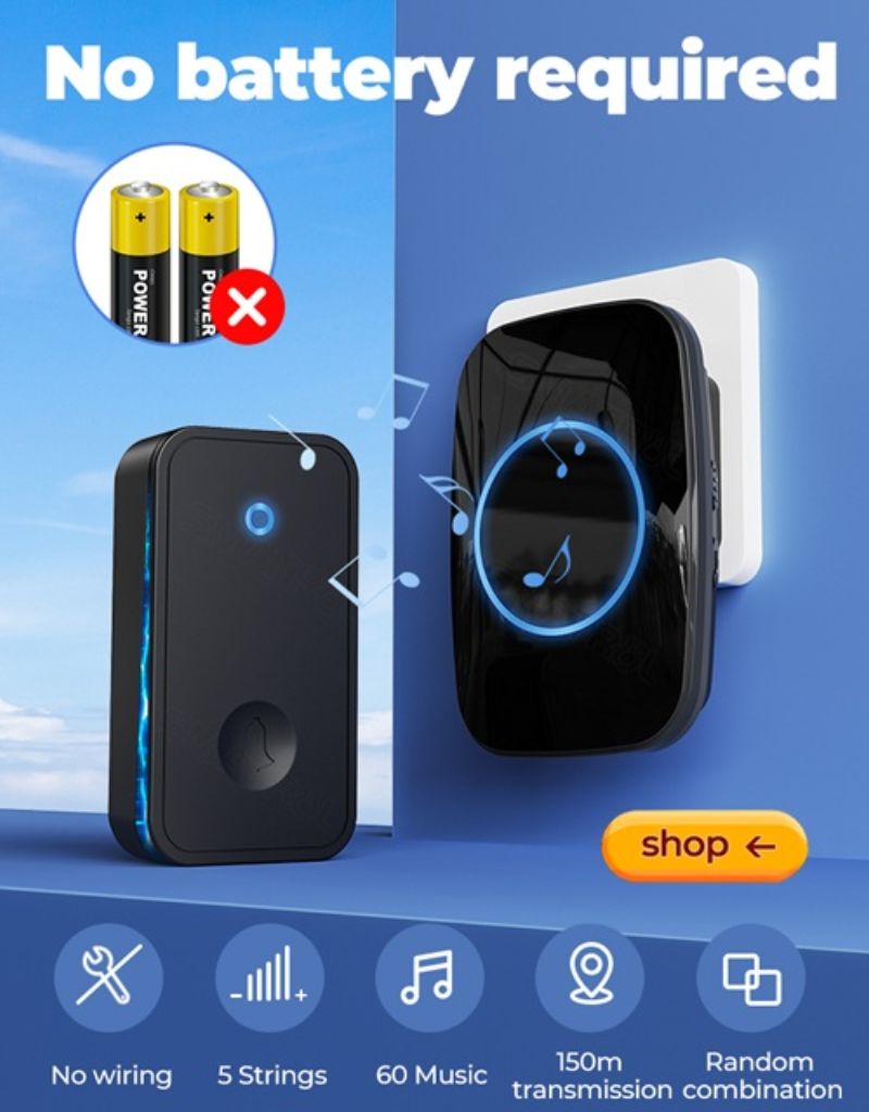 Звонок беспроводной индукционный A16Q, 150 м, 60 мелодий, с дальностью до 150 м обладает уникальной особенностью, для кнопки звонка не требуется питание и может устанавливаться на улице, водонепроницаемое исполнение. Сам звонок устанавливается в помещении с обычной вилкой 220 В. В кнопке звонка используется уникальная индукционная технология сбора энергии при нажатии на кнопку, сверхнизкая мощность потребления и беспроводная технология.
