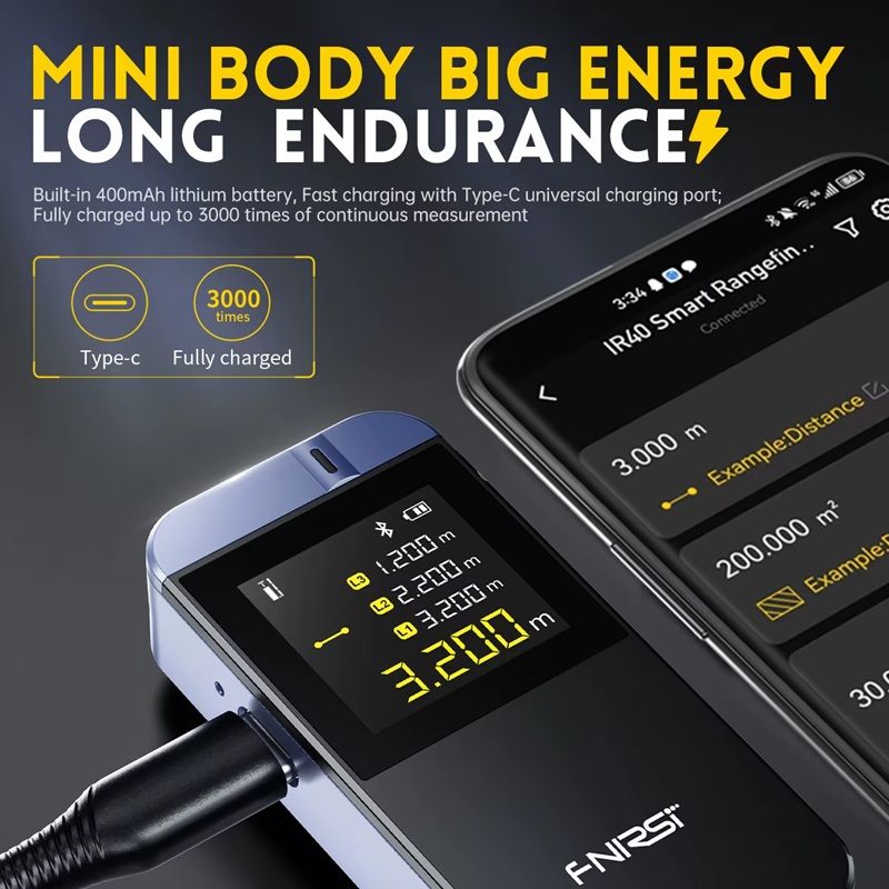 Лазерный дальномер FNIRSI IR40 — компактное и точное устройство для измерения расстояний до 40 метров, оснащённое Bluetooth и аккумулятором на 400 мАч. Этот дальномер подойдёт для строителей, дизайнеров и домашних мастеров благодаря своей точности, компактности и дополнительным функциям через мобильное приложение.