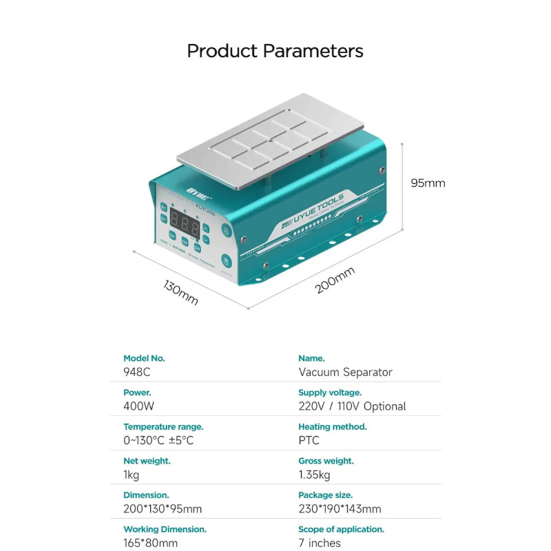 UYUE 948C — профессиональный сепаратор с подогреваемой платформой и встроенным вакуумным насосом, предназначенный для отделения сенсорного стекла от ЖК-дисплея при ремонте смартфонов и планшетов. Подходит для экранов диагональю до 7 дюймов.