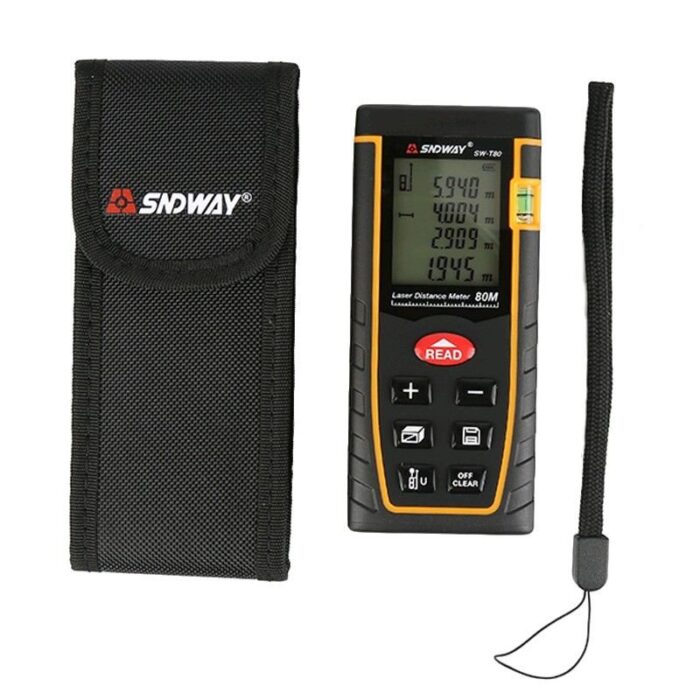 Лазерный дальномер, рулетка 80 м. Используется в строительстве, проектировании, в быту и др. Это полнофункциональная лазерная рулетка не уступающая по возможностям более дорогим моделям, позволяющая проводить мгновенные измерения с высокой точностью и большой дальностью. Предназначена для работы в помещениях, на улице при дневном с солнечном свете дальность снижается. Пузырьковый уровень используется для ориентировочного расположения рулетки при проведении горизонтальных измерений,