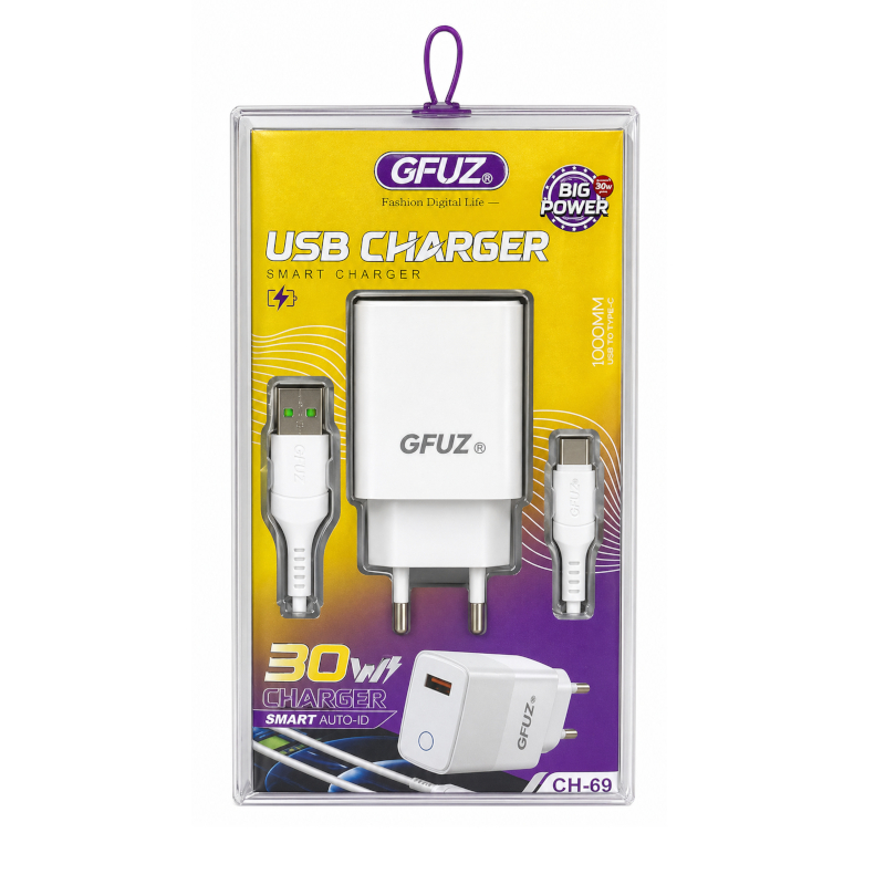 Сетевое зарядное устройство GFUZ CH-69 — компактный адаптер с поддержкой быстрой зарядки мощностью до 30 Вт. Оснащён портом USB Type-C и поддерживает современные стандарты зарядки, включая Power Delivery и Quick Charge 3.0, что обеспечивает быструю и стабильную подачу энергии для смартфонов, планшетов и других устройств.